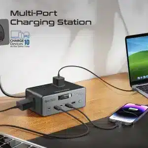 إذا تريد “محطة شحن + تشغيل” قوية لمكتبك أو بيتك، فهذا المنتج يعطيك مقابس AC للأجهزة الكهربائية، ومنافذ USB-C عالية القدرة (حتى 140W و100W) مع إجمالي USB حتى 160W، وكيبل USB-C مدمج قابل للسحب لتنظيم أفضل وشحن أسرع طوال اليوم