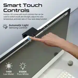 شريط إضاءة LED يثبت أعلى الشاشة ليضيء سطح المكتب ولوحة المفاتيح فقط بدون انعكاس مزعج على الشاشة، بزاوية إضاءة 45° لتقليل الوهج وتحسين التركيز وتقليل إجهاد العين. يدعم التحكم باللمس على الشريط + ريموت لاسلكي لضبط السطوع ودرجة حرارة اللون، مع ميزة التعتيم التلقائي (Auto-Dimming) ووظيفة Sleep وحفظ آخر إعداد (Memory). (رقم الموديل: HORIZON-50)